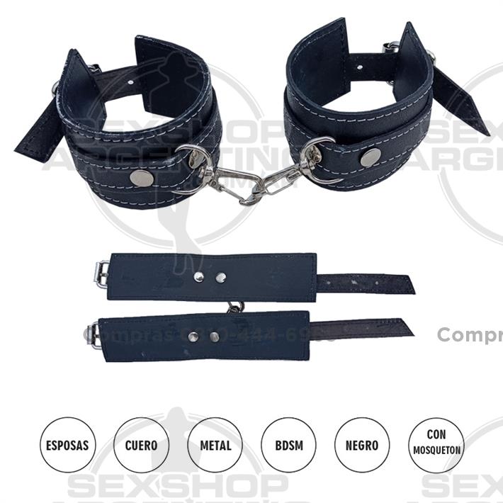 Esposas de cuero regulables con mosquetón, para usarlas separadas, para liberarte de una forma más fácil o para adicionarle unas cadenas. Materiales de primera calidad. Excelente confección.